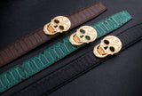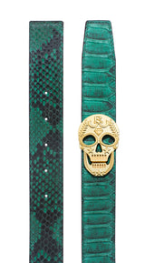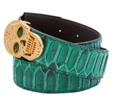 Make a statement with this bold yet sophisticated accessory. Gold plated skull buckle complimented with genuine green python skin. Brown Italian calfskin lining.