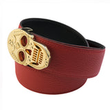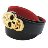 Make a statement with this bold yet sophisticated accessory. Gold plated skull buckle complimented with a reversible genuine Italian full grain calfskin leather belt. Smooth black finish on one side and a red pebble texture on the reverse.